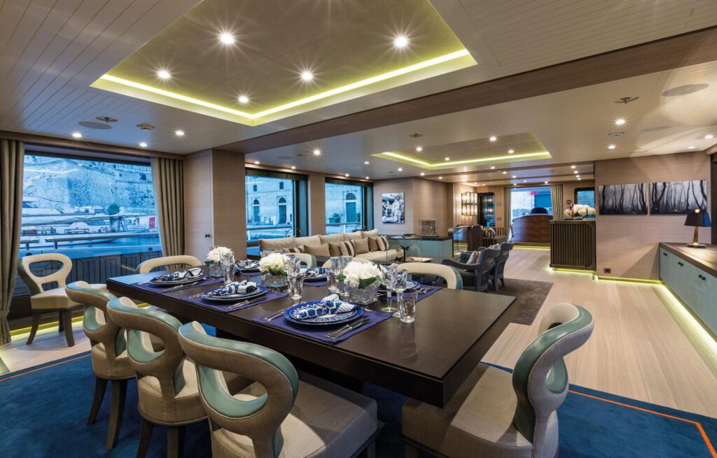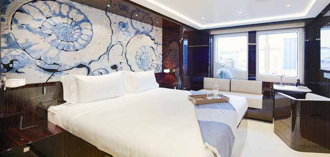 The design combines contemporary elegance with carefully crafted details, creating a warm and refined onboard atmosphere.